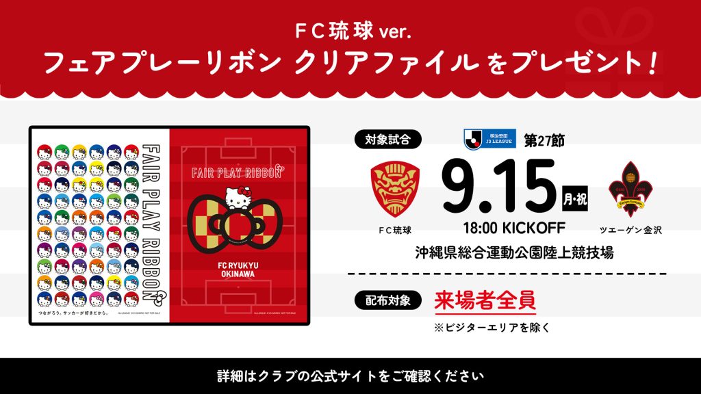 A4サイズのクリアファイルで、表面にはFC琉球のロゴとともに琉球バージョンのハローキティのリボン、裏面には全クラブのハローキティが並びます。ぜひスタジアムでゲットしてください!