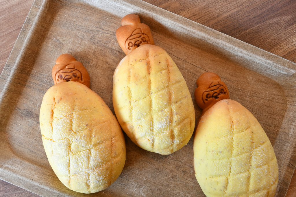 ジンベーニョが大好きなパイナップルと、王道のメロンパンが夢のコラボレーション!メロンパンの生地には沖縄県産のパインジャムを包み、パイン果汁を練り込みました。甘さの中にほのかな酸味が広がるオリジナルパンの表面には、ジンベーニョのかわいい焼印も。お子さまから大人まで楽しめる、見た目も楽しいコラボパンです。店舗販売価格:1個270円(税込)