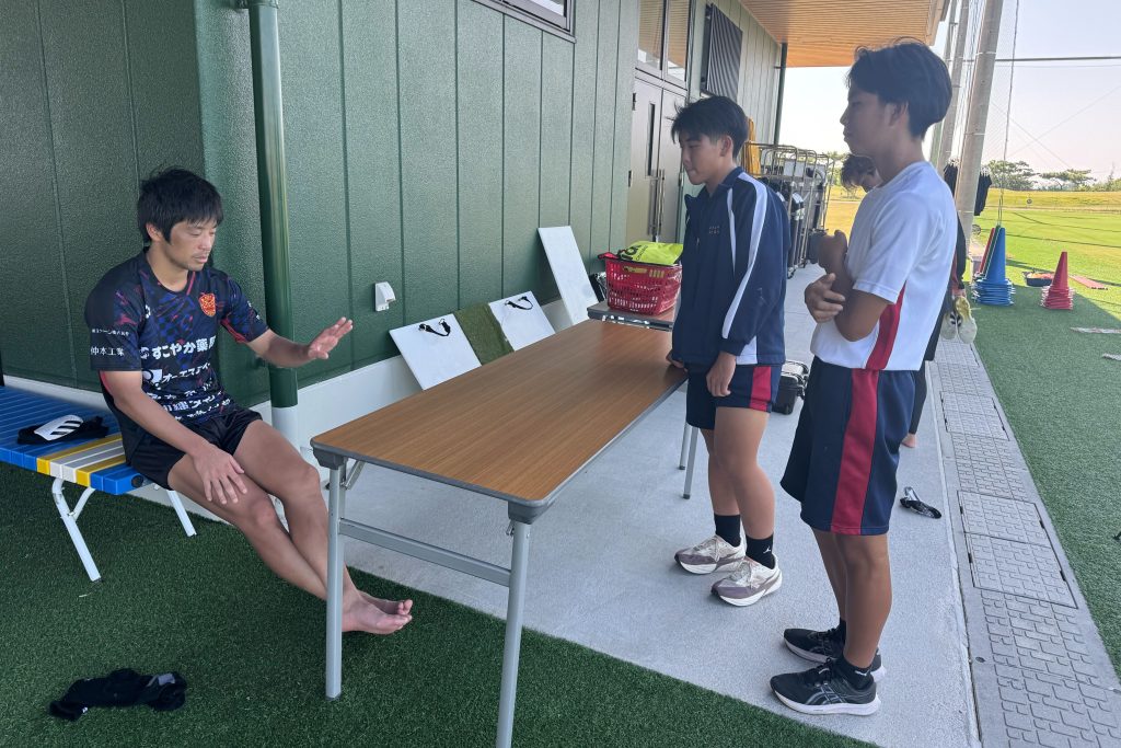 佐藤祐太キャプテンがトレーニングのコツなどを直接指導。2人とも日頃からサッカー部で頑張っているとあって、緊張しながらも熱心に聞き入っていました。