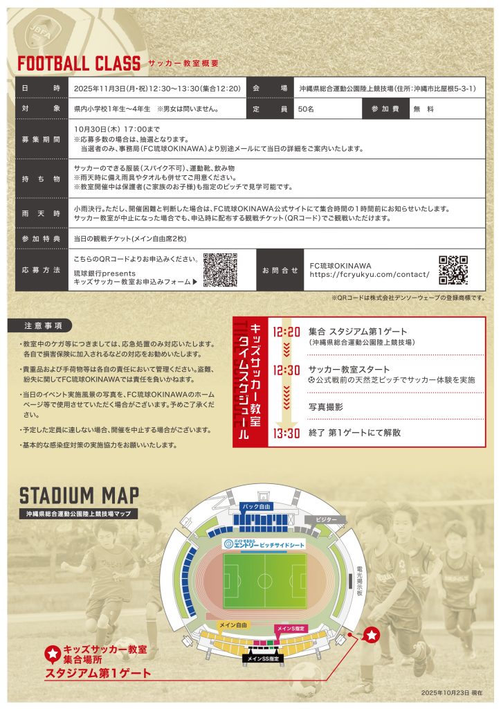 FC琉球オフィシャルトップパートナーの琉球銀行様とFC琉球の共同企画として、小学1~4年生50名を対象とした「琉球銀行presentsキッズサッカー教室」を開催致します。試合前の天然芝ピッチでサッカーを楽しみ、FC琉球を応援しよう!