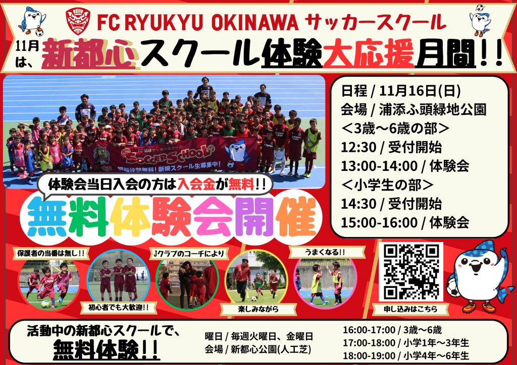 FC 琉球サッカースクールでは、現在15会場で生徒を募集中!新都心スクールでは、11/16(日)に無料体験会を実施しますのでぜひご参加ください。