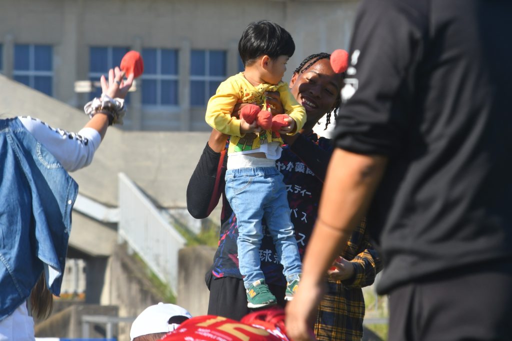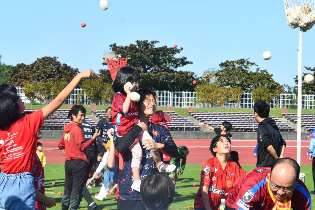 選手の私物が当たる抽選会や、借り人競争、選手と一緒に楽しむレクリエーション、トークショーなどで大盛り上がり。ファンフェスタの最後はFC琉球らしく、選手・スタッフによるハイタッチで来場者の皆さまをお見送りしました。