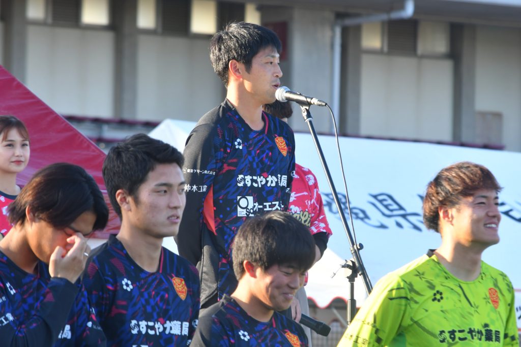 「今シーズン、皆さんの応援のおかげで走りきることができました。来シーズンも、どうか我々と一緒に闘っていただき、一緒に上を目指していただきたいと思います。声援を受けて、我々は力を発揮することができます。ぜひ来年も共闘よろしくお願いします」