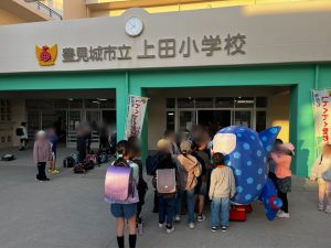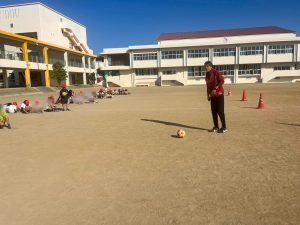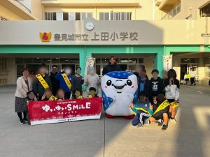 ・日 時:2/4(水)・訪問先:豊見城市 上田小学校・参加者:上原慎也クラブコミュニケーター、岩渕良太アカデミーコーチ、ジンベーニョ・内 容:挨拶運動、体育の授業、職業講話