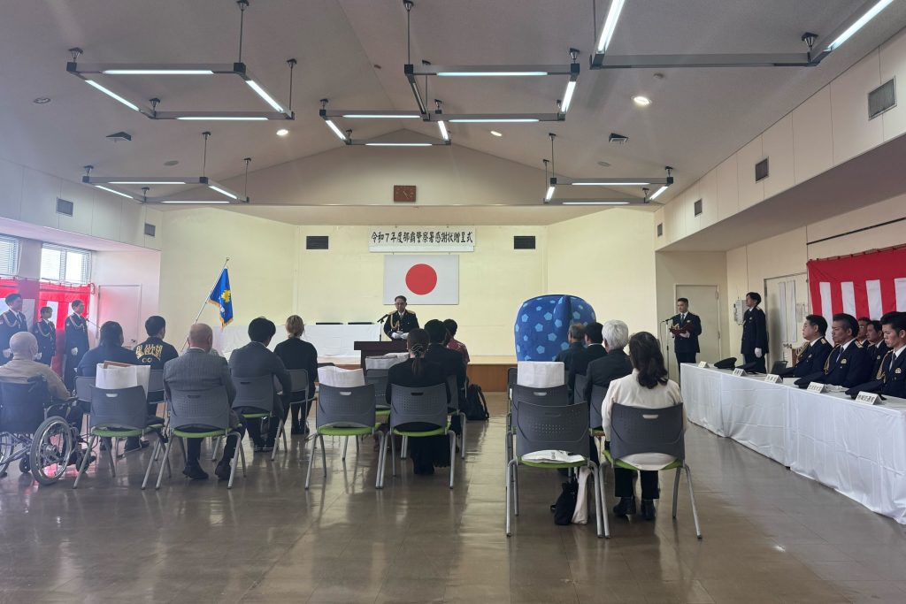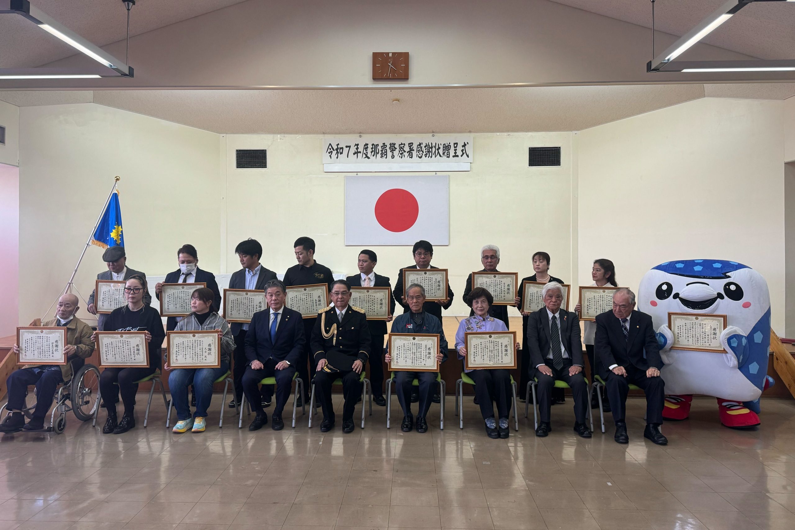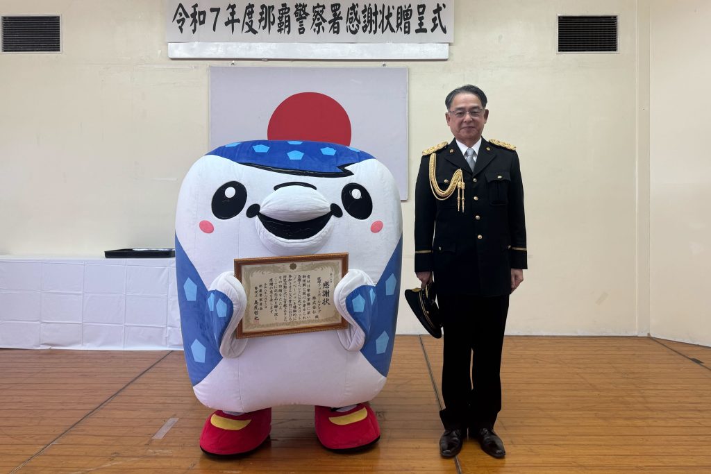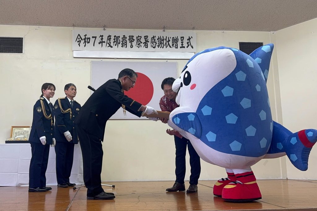 FC琉球を運営する琉球フットボールクラブ株式会社はこのたび、クラブの公式マスコット「ジンベーニョ」が地域の防犯活動に尽力・貢献したとして、那覇警察署より感謝状をいただきました。贈呈式が2月13日に那覇警察署にて行われ、ジンベーニョとフロントスタッフが参加しました。
