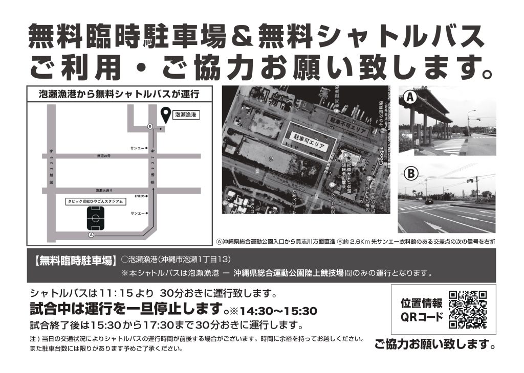 3月14日(土)に開催されるレノファ山口FC戦(沖縄県総合運動公園陸上競技場/14:00キックオフ)における、臨時駐車場&シャトルバス運行についてお知らせいたします。